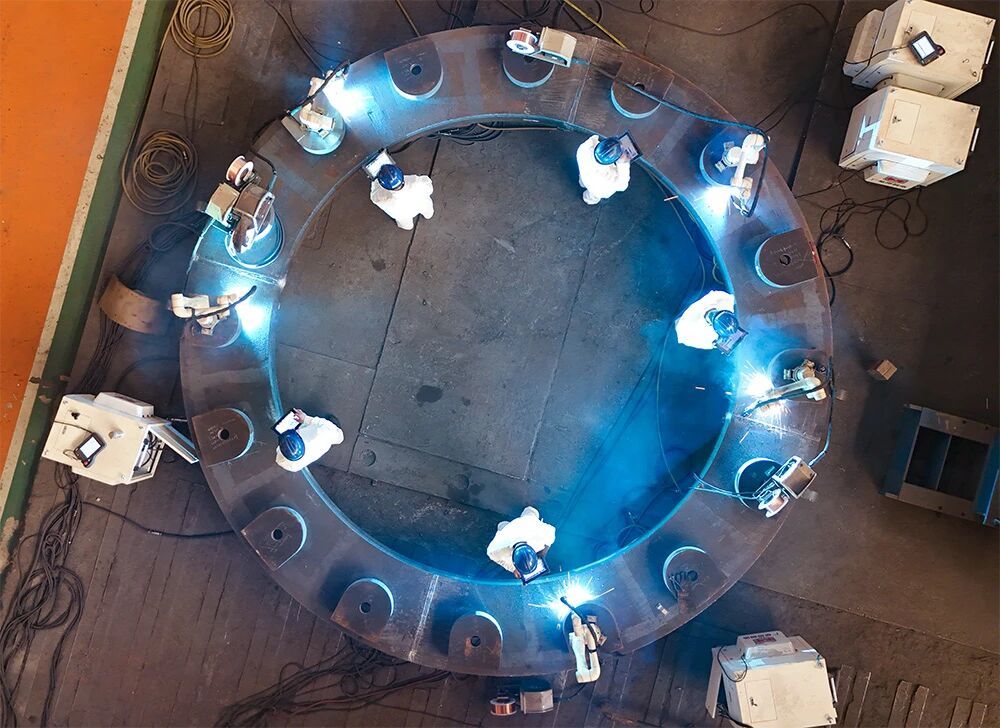 为实现成果快速转化与推广,哈电电机成立自动化应用精益小组,并建立“种子人才”培养机制,通过专题培训、经验共享等形式,构建起高效的问题解决与人才孵化体系。同时,公司组织智能制造工艺部、产品设计部,系统梳理优化影响自动化焊接的前端工艺要素,为规模化应用扫清障碍。其间,团队累计攻克技术难题29项,并于2025年8月、9月先后突破工艺通用化、底环支墩焊接等关键工艺技术,逐渐使协作机器人真正具备了集群作战的能力。